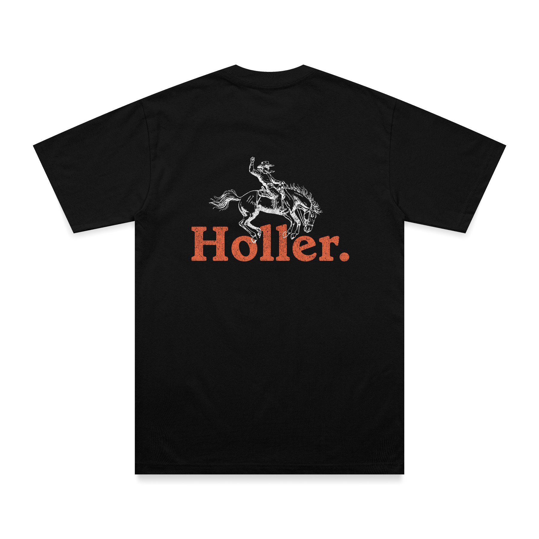 Black T-shirt with 'Holler' breast pocket logo on the front and bronco rider on the back.